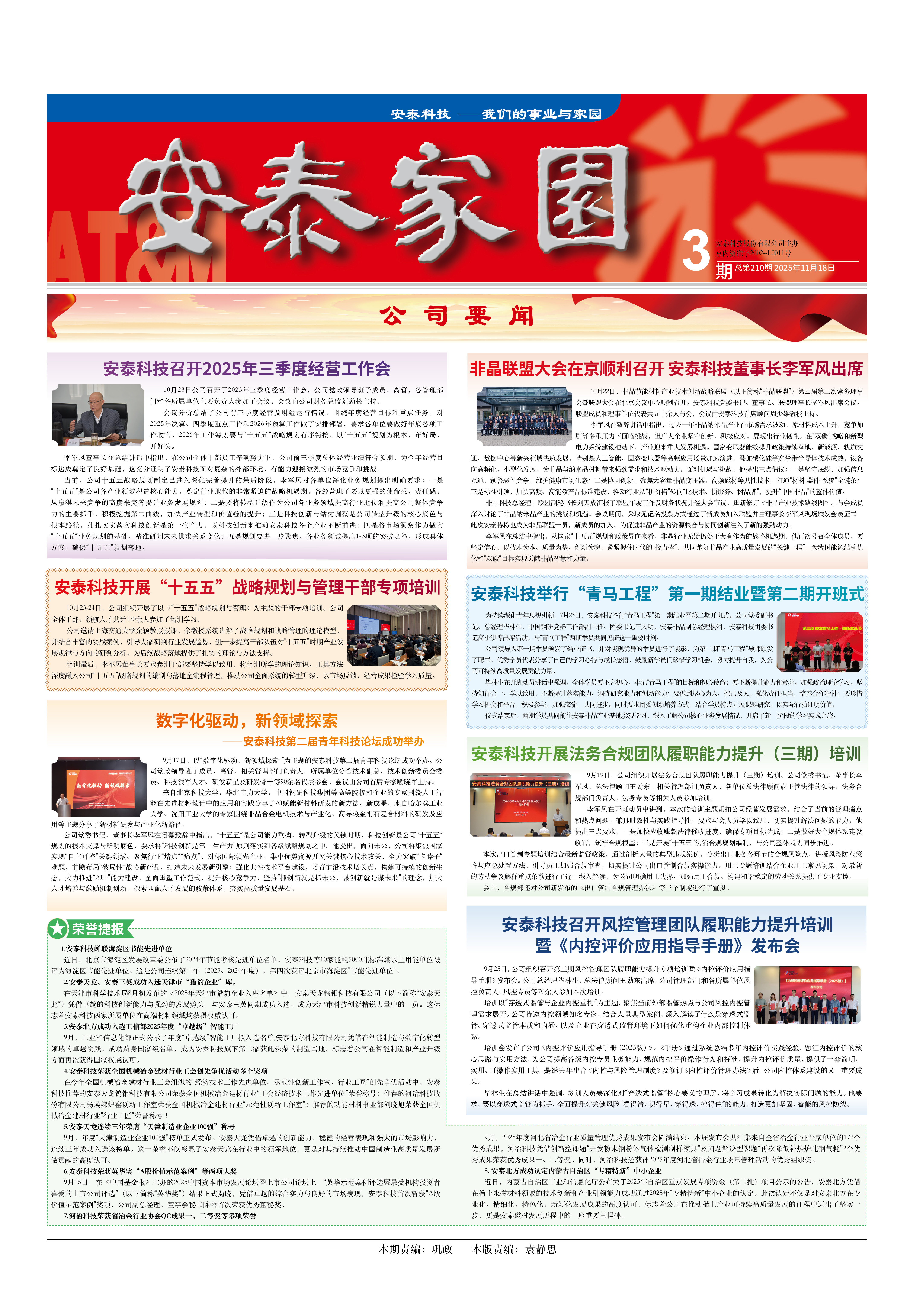 10月23日公司召开了2025年三季度谋划事情会,,,,,,,,公司党政向导班子成员、高管,,,,,,,,各管理部分和各所属单位主要认真人加入了聚会,,,,,,,,聚会由公司财务总监刘劲松主持。。。。。。。。